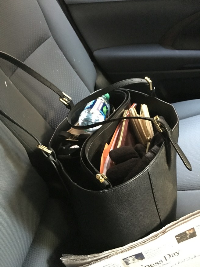 I travel for work about once per month, usually just overnight. Up until last week I had always just used my normal purse to pack for overnight trips – keeping my personal items to a bare minimum. That technique required precision and planning, was getting annoying, and looked like this: