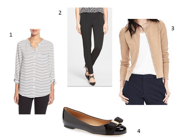 Here goes! I wore this exact outfit last week. The pants have become a favorite of mine -they have stretch, but don’t get saggy, and are totally comfy. I actually just bought them in grey as well because i love them so much. The shirt is a new purchase and I can already tell I will get a lot of use out of it, not just at work, but on weekends in the winter with black skinny jeans, or in the summer with white. The cardigan is boring, sure, but classic. And the shoes…a HUGE splurge. I got them 2 years ago now (when i found them on sale for $350) and I wear them almost every day at work – in fact i leave them under my desk. I completely get that $500 for a pair of shoes is absurd – it’s totally absurd. But if you can find them on sale, they are worth considering.