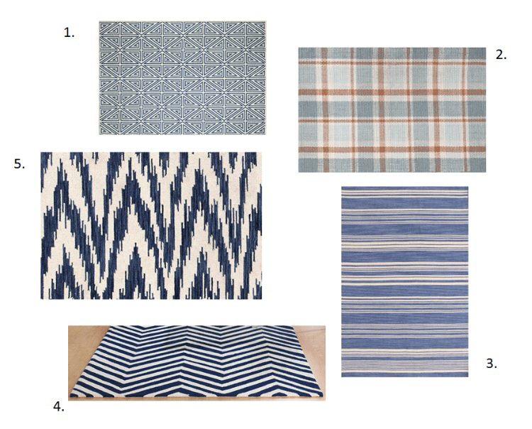 If money were no thang, I would love to try the blue and white chekat rug below. This 100% wool beauty is soft and substantial, and would be perfect.