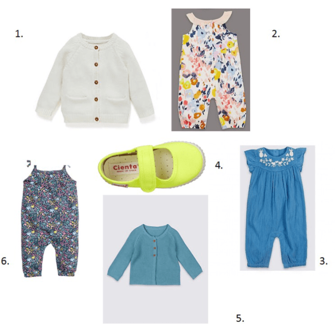 1. White cardigan / 2.Watercolor romper/ 3. Blue embroidered romper / 4. Chartreuse shoes / 5. Turquoise cardigan / 6. Liberty Print Romper