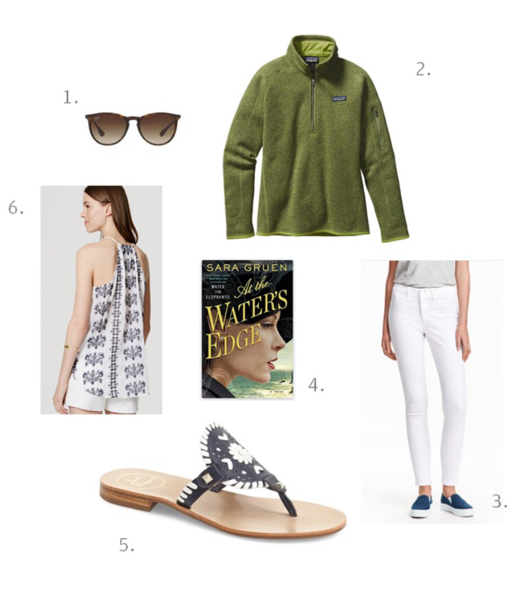 1. Raybans /2.Patagonia Better Sweater /3. White skinny jeans/4. A new beach read/5.Flip flops/6. Flowy top (40% off!)