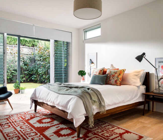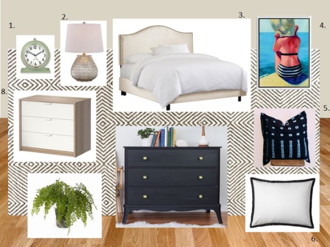 1.Alarm clock/ 2.Lamp/ 3.Bed/ 4.Painting/ 5.Mudcloth Pillow/ 6.Sham/ 8.Bedside table