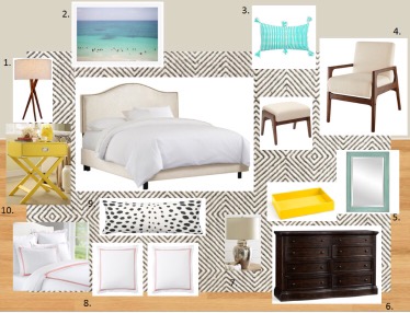 1.Table lamp /2. Art/ 3.Accent pillow/ 4.Chair/ 5.Mirror/ 6.Dresser/ 7.Lamp/ 8.Sham and Duvet/ 9.Lumbar pillow/ 10.Side table