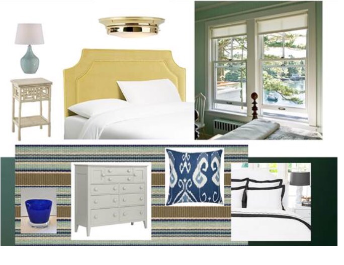 Here is the idea board with my thoughts – hunter green with brass accents, simple cotton striped rug, crisp black border duvet, chartreuse velvet headboard: