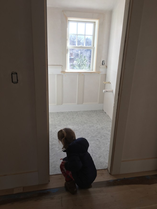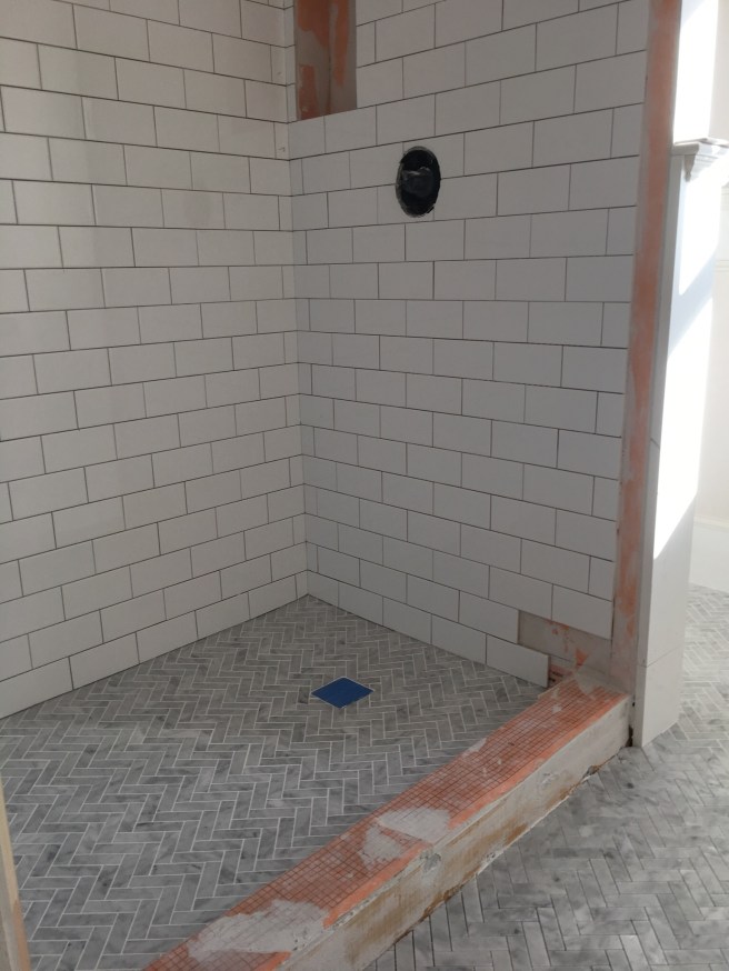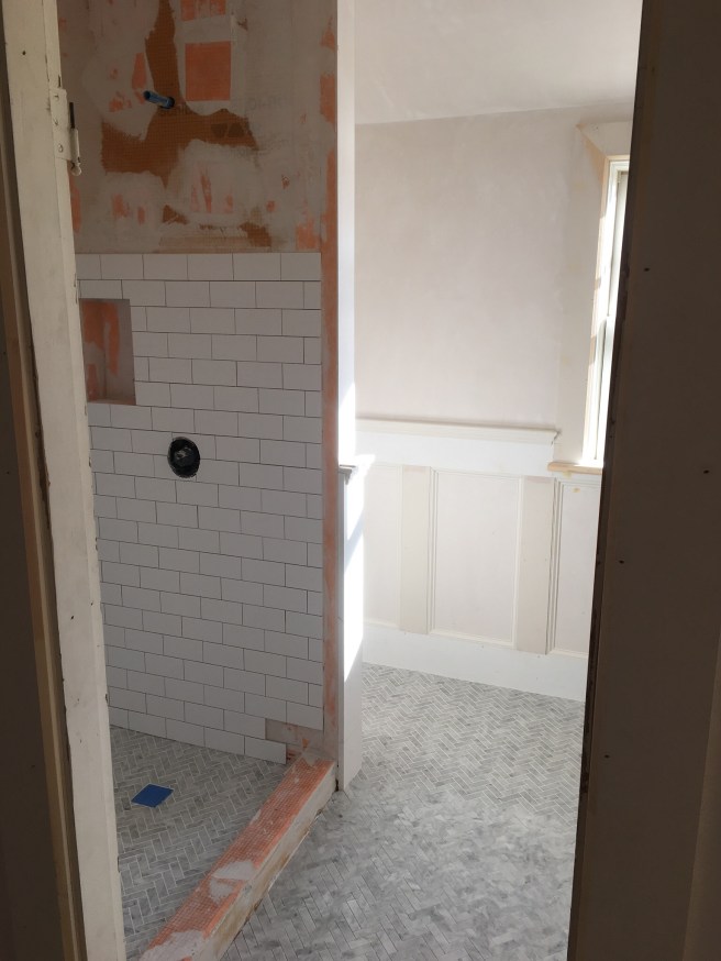 We ultimately decided to scrap the shower in the bathroom (this will be mostly used for guests running in from the back deck and pool, and we have an outdoor shower that we installed last summer). Instead, we moved the washer/dryer into the bathroom to free up more space for kid play.