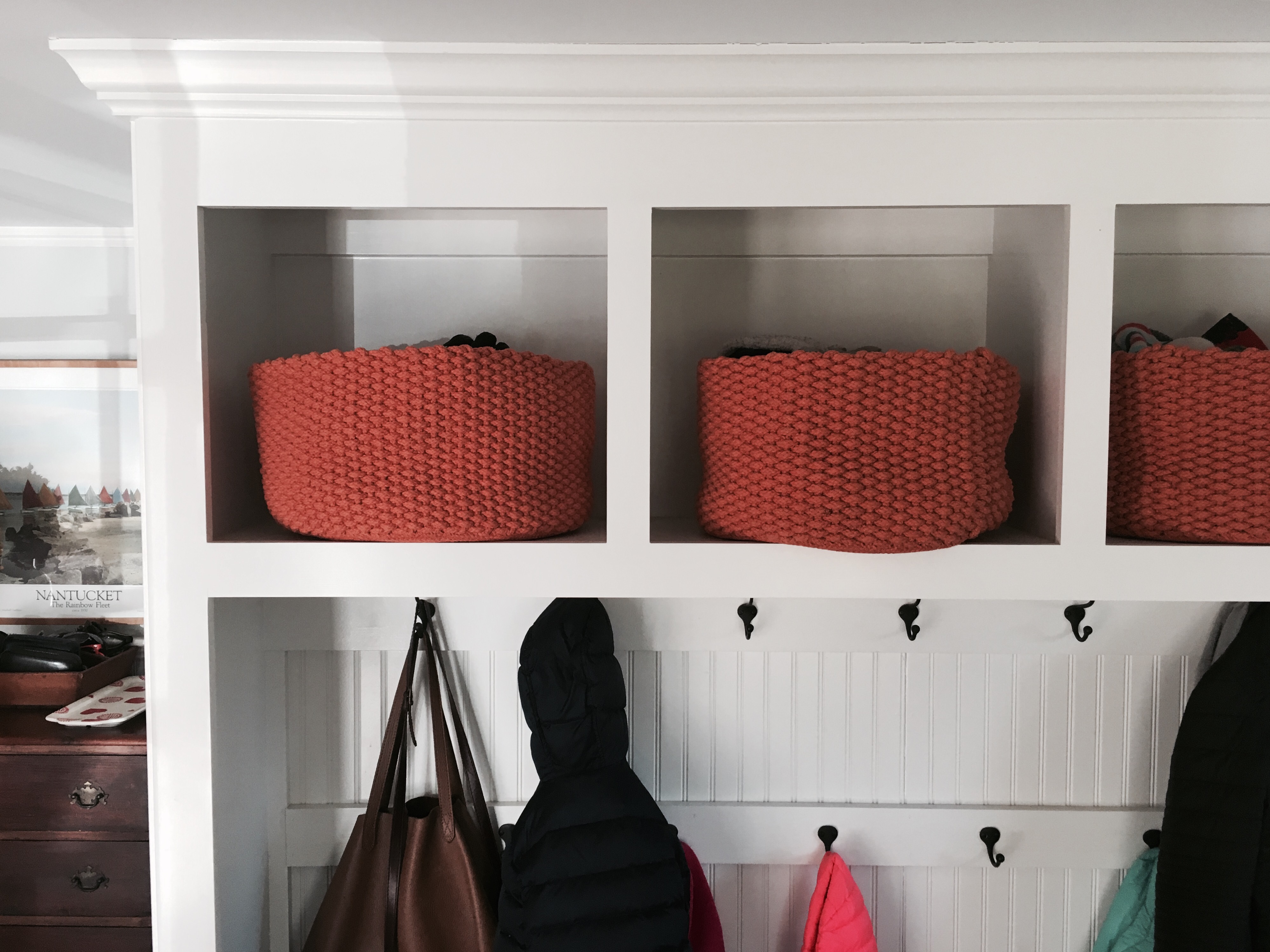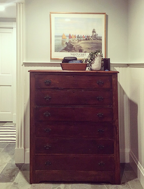 We decided to go with a bureau, because we wanted lots of drawers, as opposed to shelves. I’ve long admired the furniture at room and board, and settled on the Berkeley Dresser – with clean lines, beautiful walnut wood, and satin nickel pulls to echo the nickel metal in the chandelier and curtain hardware.